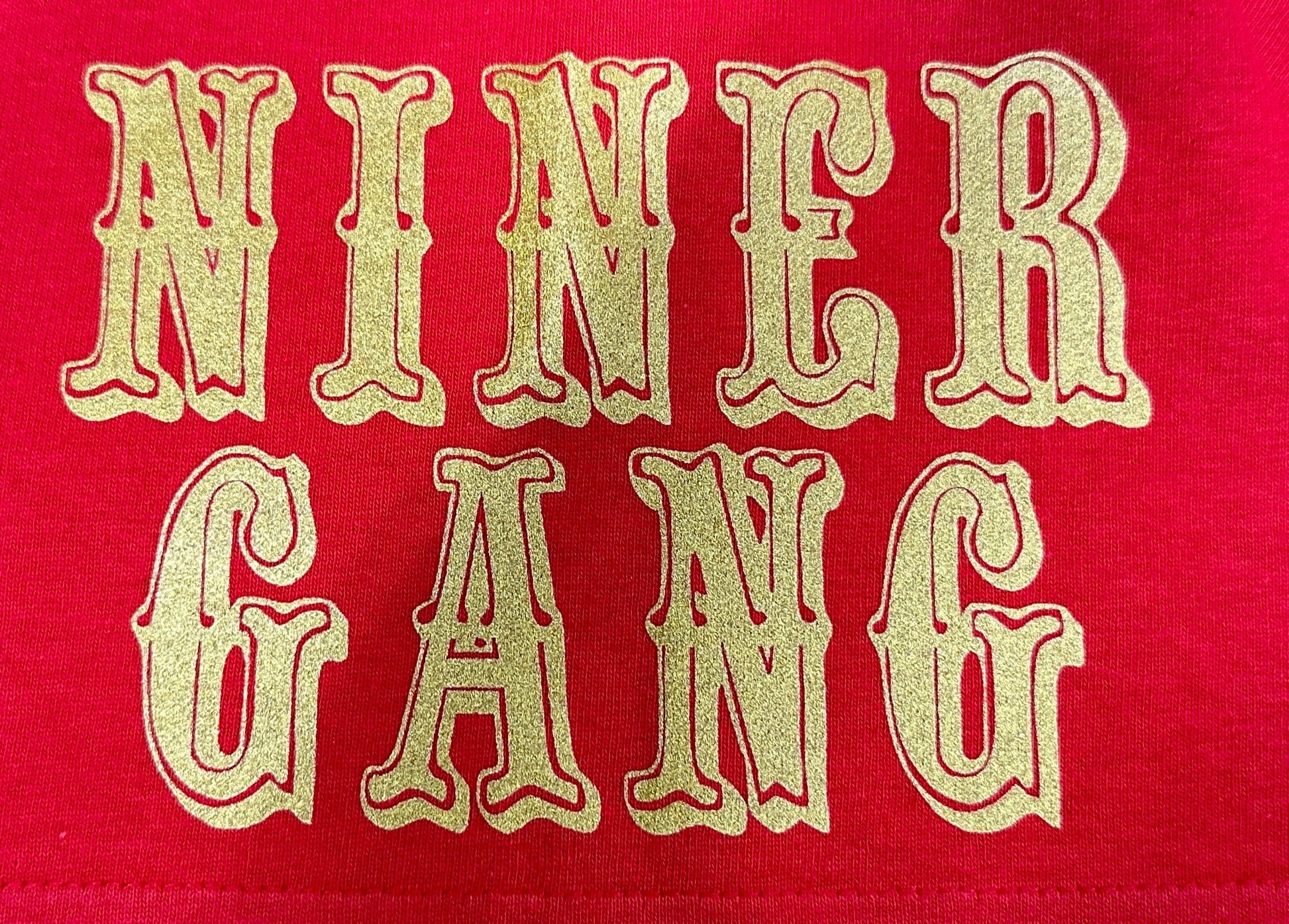 Bang Bang Niner Gang Hd Red T-Shirt (Limited Edition). Red T-Shirt With Metallic Gold Print On Chest (Bang Bang Niner Gang) & Bottom Side (Niner Gang).