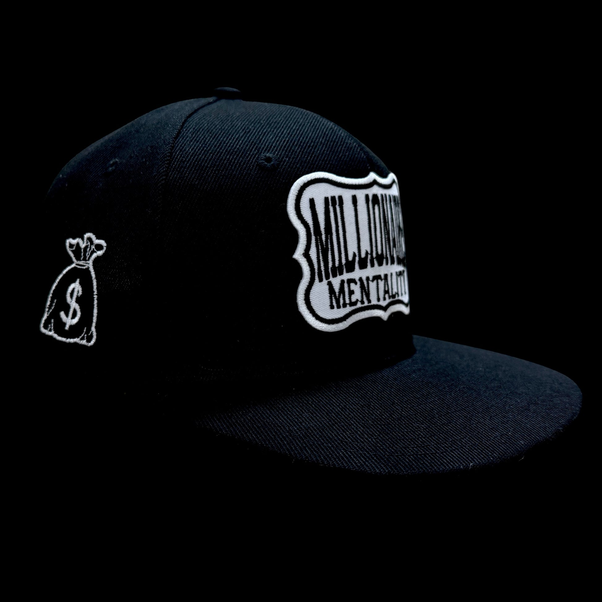 Black Snapback Baseball Hat with Black & White Embroidery on Front & Side.