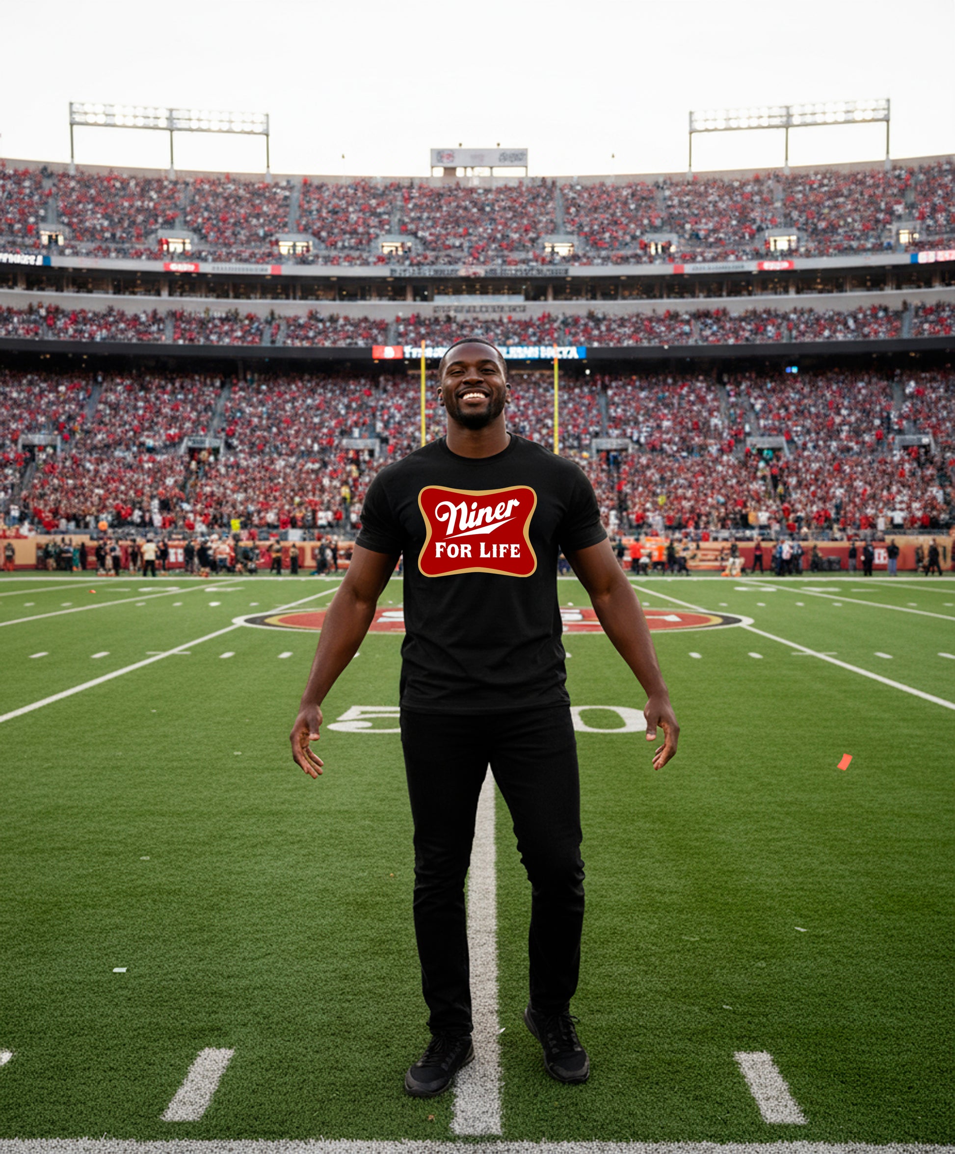 Niner For Life T-Shirt (Limited Edition). T-Shirt with Red, White & Gold Print on chest & bottom side (NINER GANG).